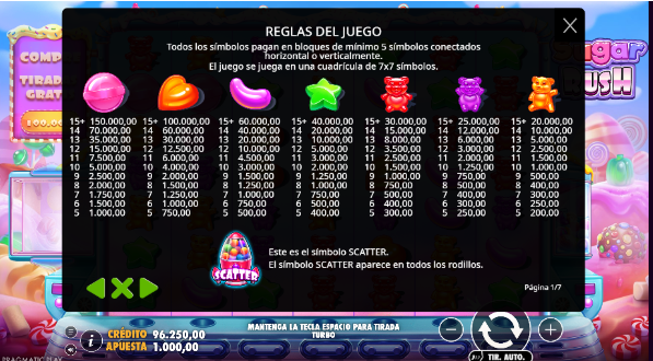Funcionalidades Únicas: Al jugar Sugar Rush slot, es posible activar tiradas gratis con multiplicadores. Las tiradas gratis pueden ser reactivadas. Durante las mismas, los multiplicadores no se reinician entre los giros. Son acumulados y aumentan durante el bono.